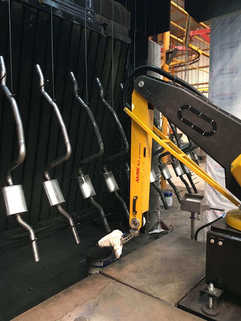 BG电子中国大陆艾普机器人可完成对喷涂机器人的设计并对相关产品提供定制化解决方案,:如汽车轮毂、排气管、铝塑、五金等可以悬吊方式的喷涂的相关产品。 根据客户生产要求,我们的喷涂机器人可以和悬吊线(正反向传输均可)配合进行喷涂工作,也可利用用户现场已有的传输装置进行适应性改造。