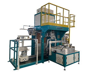 工作流程:上袋机利用真空吸盘从备袋库取袋-送袋-自动理袋、输送-自动开袋-自动上袋-夹袋-自动填充-颠袋振动-自动抱袋-自动导入-自动缝包或热合