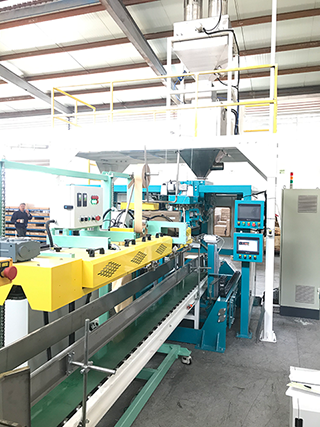 工作流程:上袋机利用真空吸盘从备袋库取袋-送袋-自动理袋、输送-自动开袋-自动上袋-夹袋-自动填充-颠袋振动-自动抱袋-自动导入-自动缝包