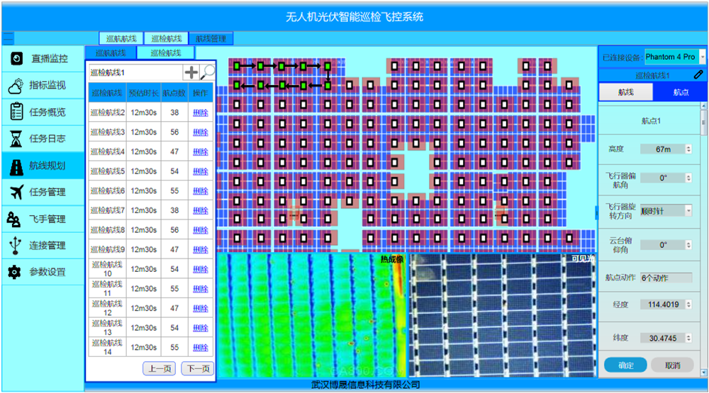 ´ËÍ⣬PC¶ËÒ²¿É½ÓÊÕÎÞÈË»ú´«»ØµØÃæµÄÔËÐÐÐÅÏ¢£¬ÊµÏÖ¶ÔÎÞÈË»ú»ù´¡ÐÅÏ¢£¨·ÉÐÐ×ø±ê¡¢µç³ØµçÁ¿¡¢GPSÐźš¢Ò£¿ØÐźš¢Í¼´«ÖÊÁ¿¡¢ÔÆÌ¨¸©Ñö½Ç¡¢ÎÞÈË»úÆ«º½½Ç¡¢·ÉÐÐËÙ¶È£©µÄÔ¶³Ì¼à¿Ø£¬²¢¸ù¾ÝÎÞÈË»ú¹¤×÷ģʽչʾÎÞÈË»úѲ¼ìµÄ״̬£¨×Ô¶¯/ÊÖ¶¯£©¡£Ñ²¼ìÈÎÎñÒÔµØÌúÏß·ͼµÄÐÎʽ¶ÔѲ¼ì·Ïß¡¢Ñ²¼ì½ø¶È¼°Ïß·ÐÅÏ¢½øÐÐʵʱչʾ¡£Ëõ½øÒÀ¾ÝѲ¼ìÇøÓòµØÀíµØÊÆÐÅÏ¢£¬½áºÏÎÞÈË»ú²â»æ¼°Éè¼ÆÐÅÏ¢£¬ÒÔ¶ÔÓ¦±ÈÀý³ß»æÖÆÑ²¼ìÇøÓòÐÅϢСµØÍ¼£¬ÉèÖÃÎÞÈË»úµÄ·ÉÐк½µã£¬ÔÚº½µã´¦ÉèÖÃÎÞÈË»ú¶¯×÷£¬ËæºóÔÚÂú×ãÎÞÈË»úµçÁ¿Ðøº½¼°ÈÎÎñʱ³¤µÄÌõ¼þÏÂÒÀ´ÎÁ¬½Ó¸÷º½µãÐг̵¥Ò»µÄ·ÉÐк½Ïߣ¬ÔÚ´Ë»ù´¡ÉÏÇø·ÖѲ¼ìº½Ïß¼°Ñ²º½º½Ïߣ¬Âú×㲻ͬ×÷ÒµÐèÇó¡£